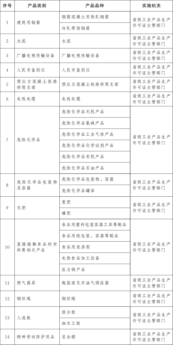 為保障重要工業(yè)產(chǎn)品質(zhì)量安全,強(qiáng)化產(chǎn)品準(zhǔn)入管理和源頭治理,防范產(chǎn)品質(zhì)量安全重大風(fēng)險(xiǎn),確保人民群眾生命財(cái)產(chǎn)安全和公共安全,國務(wù)院決定,調(diào)整完善工業(yè)產(chǎn)品生產(chǎn)許可證管理目錄,對冷軋帶肋鋼筋、瓶裝液化石油氣調(diào)壓器、鋼絲繩、膠合板、細(xì)木工板、安全帽等6種產(chǎn)品實(shí)施工業(yè)產(chǎn)品生產(chǎn)許可證管理。調(diào)整后,實(shí)施工業(yè)產(chǎn)品生產(chǎn)許可證管理的產(chǎn)品共計(jì)14類27個(gè)品種,由省級工業(yè)產(chǎn)品生產(chǎn)許可證主管部門負(fù)責(zé)實(shí)施,相關(guān)審批權(quán)限不得下放。同時(shí),化肥生產(chǎn)許可證審批方式由告知承諾調(diào)整為“先核后證”審批。