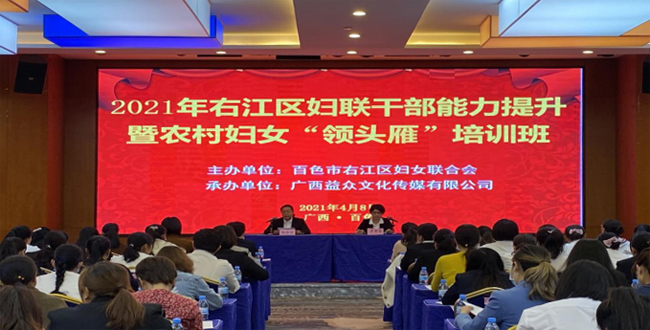 ????????為提高新一屆村(社區(qū))婦聯(lián)主席業(yè)務(wù)水平和履職能力,提升婦女干部的內(nèi)在素質(zhì),盡快進入婦聯(lián)工作角色,4月8日至9日,百色市右江區(qū)婦女聯(lián)合會主辦,廣西益眾文化傳媒有限公司承辦2021年右江區(qū)婦聯(lián)干部能力提升暨農(nóng)村婦女“領(lǐng)頭雁”培訓(xùn)班,來自各鄉(xiāng)鎮(zhèn)(街道)、村(社區(qū))婦聯(lián)主席或負責婦聯(lián)工作同志、執(zhí)委等一百多人參加本期培訓(xùn)。