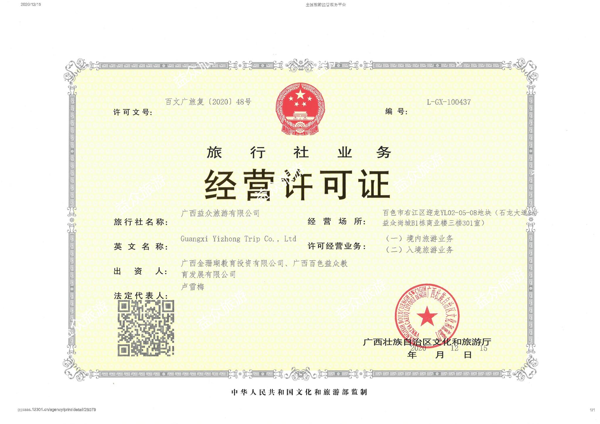 ????????12月15日,廣西益眾旅游有限公司通過廣西壯族自治區(qū)文化和旅游廳各項認證,符合國家各項標準要求,獲得了旅行社業(yè)務經(jīng)營許可證。