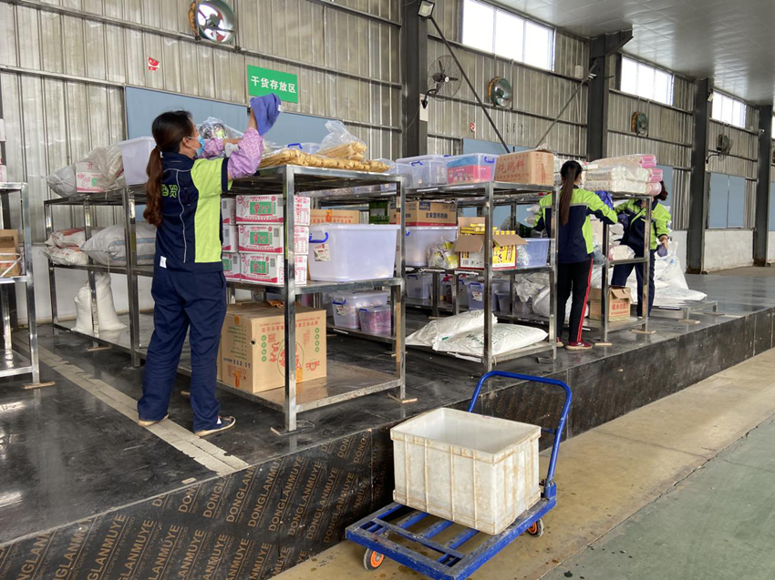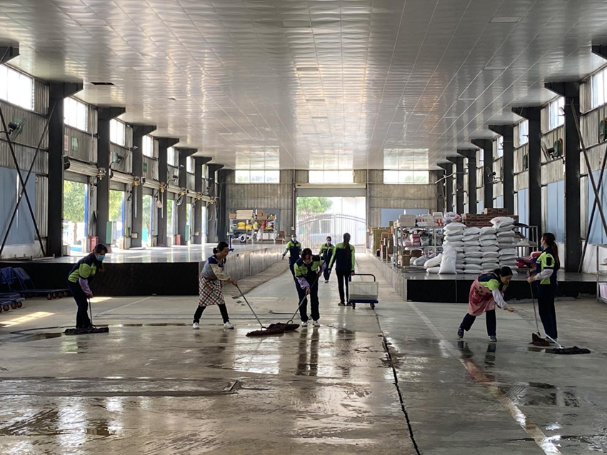 在倉庫,員工們對(duì)貨物架、倉庫地板進(jìn)行清潔、擦拭,保證貨物在合適的環(huán)境下儲(chǔ)存。