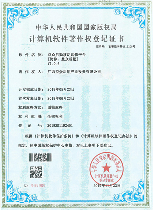 日前,經(jīng)中國(guó)版權(quán)保護(hù)中心審核,由益眾后勤公司提交的《益眾后勤移動(dòng)購(gòu)物平臺(tái)》符合《計(jì)算機(jī)軟件保護(hù)條例》和《計(jì)算機(jī)軟件著作權(quán)登記辦法》的相關(guān)規(guī)定,被認(rèn)定為原始取得,并獲得中華人民共和國(guó)國(guó)家版權(quán)局頒發(fā)的《計(jì)算機(jī)軟件著作權(quán)登記證書(shū)》。