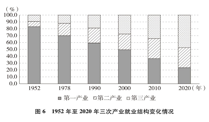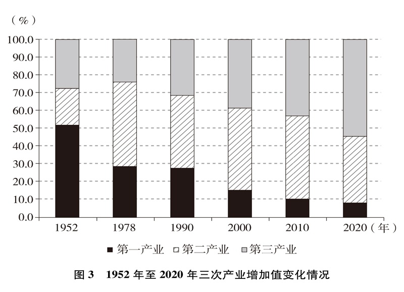 產(chǎn)業(yè)結(jié)構(gòu)優(yōu)化升級(jí)。中國(guó)已建成世界上最完整的產(chǎn)業(yè)體系,產(chǎn)業(yè)發(fā)展持續(xù)向中高端邁進(jìn)。三次產(chǎn)業(yè)增加值之比從1952年的50.5∶20.8∶28.7到2020年的7.7∶37.8∶54.5,中國(guó)從傳統(tǒng)農(nóng)業(yè)大國(guó)成為工業(yè)大國(guó)、服務(wù)業(yè)大國(guó)(圖3),中國(guó)經(jīng)濟(jì)從依賴單一產(chǎn)業(yè)為主轉(zhuǎn)向依靠三次產(chǎn)業(yè)共同帶動(dòng)。農(nóng)業(yè)現(xiàn)代化成效顯著,機(jī)械化、數(shù)字化、綠色化、功能化、共享化水平明顯提高,廣大農(nóng)民逐步告別“面朝黃土背朝天、一身力氣百身汗”的辛勞,農(nóng)村生產(chǎn)力極大解放;糧食生產(chǎn)能力穩(wěn)步提升,實(shí)現(xiàn)谷物基本自給,中國(guó)人把飯碗牢牢端在自己手中。中國(guó)建成門(mén)類(lèi)齊全、獨(dú)立完整的現(xiàn)代工業(yè)體系,工業(yè)化和信息化融合發(fā)展的廣度和深度不斷拓展,“中國(guó)制造”向“中國(guó)智造”轉(zhuǎn)型升級(jí),產(chǎn)業(yè)鏈供應(yīng)鏈現(xiàn)代化水平進(jìn)一步提升。以新一代信息技術(shù)、生物技術(shù)、高端裝備、綠色環(huán)保為代表的戰(zhàn)略性新興產(chǎn)業(yè)發(fā)展迅速,成為引領(lǐng)高質(zhì)量發(fā)展的重要引擎。數(shù)字經(jīng)濟(jì)激發(fā)經(jīng)濟(jì)發(fā)展新活力,產(chǎn)業(yè)數(shù)字化和數(shù)字產(chǎn)業(yè)化趨勢(shì)加快?,F(xiàn)代服務(wù)業(yè)加速發(fā)展,以“互聯(lián)網(wǎng)+”為標(biāo)志的新業(yè)態(tài)、新模式層出不窮,平臺(tái)經(jīng)濟(jì)、共享經(jīng)濟(jì)蓬勃興起,生產(chǎn)性服務(wù)業(yè)向?qū)I(yè)化和高端化發(fā)展,生活性服務(wù)業(yè)向精細(xì)化和高品質(zhì)轉(zhuǎn)變。產(chǎn)業(yè)結(jié)構(gòu)的優(yōu)化升級(jí)促進(jìn)了經(jīng)濟(jì)更加均衡、更加充分的發(fā)展,人們個(gè)性化品質(zhì)化多樣化需求不斷得到滿足。