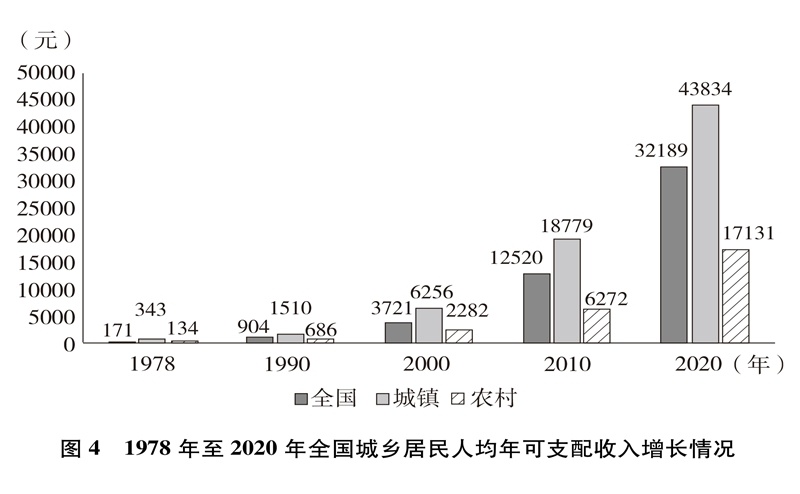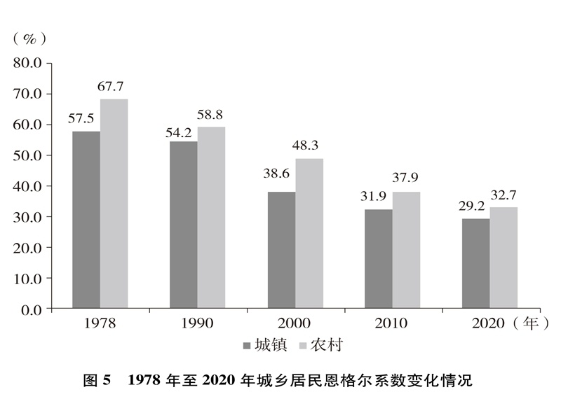 人民生活水平顯著提高。居民收入持續(xù)增加,全國(guó)居民人均年可支配收入從1978年的171元增加到2020年的32189元(圖4)。城鄉(xiāng)居民恩格爾系數(shù)分別從1978年的57.5%、67.7%下降到2020年的29.2%、32.7%(圖5),城鄉(xiāng)居民生活質(zhì)量不斷提升。溫飽問(wèn)題解決后,人們對(duì)生活品質(zhì)、品位有了更高的追求,衣食住行不斷升級(jí),消費(fèi)結(jié)構(gòu)從生存型逐漸向發(fā)展型、享受型過(guò)渡。衣,從穿暖到穿美、穿出時(shí)尚;食,從吃飽到吃好、吃出健康;住,從有所居到更敞亮、更宜居;行,從便利通暢到快捷舒適。吃穿用有余,家電全面普及,乘用汽車(chē)快速進(jìn)入尋常百姓家。餐飲、健康、教育、旅游、文娛等服務(wù)性消費(fèi)持續(xù)快速增長(zhǎng),在居民人均消費(fèi)支出中占比逐漸達(dá)到一半左右。越來(lái)越多的人有“錢(qián)”有“閑”,“詩(shī)和遠(yuǎn)方”更加觸手可及,“說(shuō)走就走”不再是夢(mèng)想,旅游扮靚人們的幸福生活,中國(guó)正在進(jìn)入大眾旅游時(shí)代。