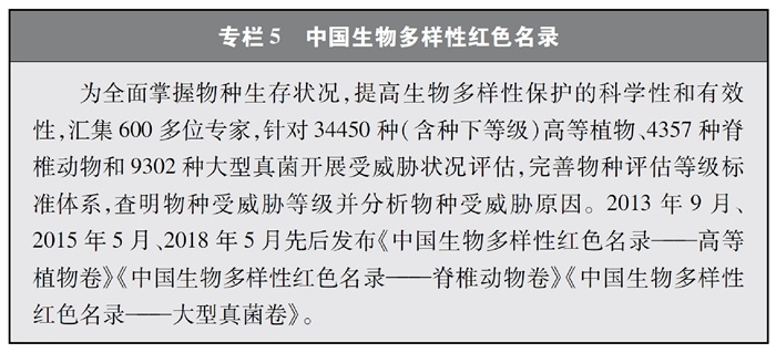 開展全國生物多樣性調(diào)查與評估。大力推進(jìn)生物多樣性保護(hù)重大工程實施,結(jié)合自然資源調(diào)查、生態(tài)系統(tǒng)監(jiān)測評估等工作,不斷完善生物多樣性調(diào)查與評估能力,首次將生物多樣性指標(biāo)納入生態(tài)質(zhì)量綜合評價指標(biāo)體系,引導(dǎo)地方加強(qiáng)生態(tài)文明建設(shè)與生物多樣性保護(hù)。開展自然資源調(diào)查,包括森林、草原、水、濕地、荒漠、海洋等,建立自然資源調(diào)查評價監(jiān)測制度。構(gòu)建了涵蓋2376個縣級行政單元、樣線總長超過3.4萬公里的物種分布數(shù)據(jù)庫,建立物種資源調(diào)查及收集信息平臺,準(zhǔn)確反映野生動植物空間分布狀況。完成長江經(jīng)濟(jì)帶、京津冀等國家戰(zhàn)略區(qū)域180多個縣級行政區(qū)生物多樣性調(diào)查與評估。組織開展近海漁業(yè)資源調(diào)查,初步掌握近海漁業(yè)資源狀況。陸續(xù)發(fā)布《中國植物紅皮書》《中國瀕危動物紅皮書》《中國物種紅色名錄》《中國生物多樣性紅色名錄》,基本掌握生物多樣性總體情況,為加強(qiáng)生物多樣性保護(hù)奠定了科學(xué)基礎(chǔ)。