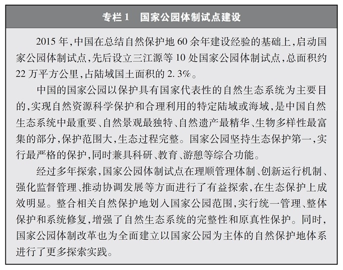 中國堅持在發(fā)展中保護(hù)、在保護(hù)中發(fā)展,提出并實施國家公園體制建設(shè)和生態(tài)保護(hù)紅線劃定等重要舉措,不斷強(qiáng)化就地與遷地保護(hù),加強(qiáng)生物安全管理,持續(xù)改善生態(tài)環(huán)境質(zhì)量,協(xié)同推進(jìn)生物多樣性保護(hù)與綠色發(fā)展,生物多樣性保護(hù)取得顯著成效。