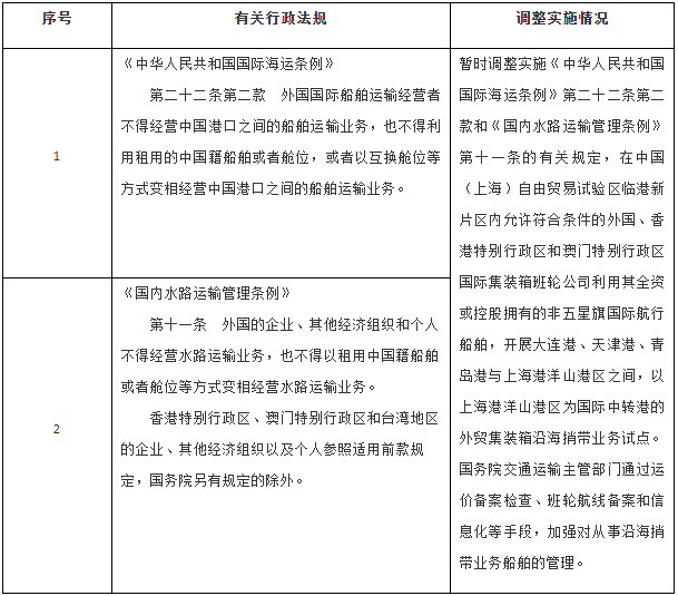 一、按照《中國(上海)自由貿(mào)易試驗區(qū)臨港新片區(qū)總體方案》,同意自即日起至2024年12月31日,在中國(上海)自由貿(mào)易試驗區(qū)臨港新片區(qū)暫時調(diào)整實施《中華人民共和國國際海運條例》《國內(nèi)水路運輸管理條例》的有關(guān)規(guī)定(目錄附后)。