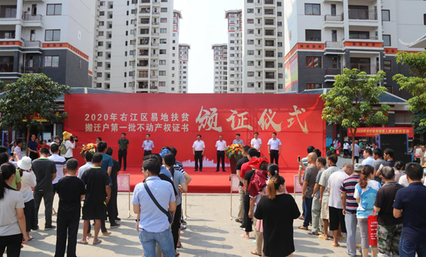 5月16日上午,右江區(qū)“老鄉(xiāng)家園—迎龍易地扶貧搬遷安置小鎮(zhèn)”搬遷戶不動產(chǎn)權(quán)證書頒證儀式在安置小鎮(zhèn)舉行,第一批26戶搬遷戶順利拿到了產(chǎn)權(quán)證書。百色市發(fā)改委副主任、市水庫和扶貧易地安置管理局局長羅加攀,右江區(qū)委常委、區(qū)人民政府副區(qū)長岑萬興,右江區(qū)委常委、宣傳部部長、區(qū)人民政府副區(qū)長王世凡,右江區(qū)委常委、辦公室主任盧靈及右江區(qū)直單位、鄉(xiāng)鎮(zhèn)代表,廣西百色益眾投資有限公司董事長、總經(jīng)理趙家臣出席儀式。儀式由王世凡主持。
